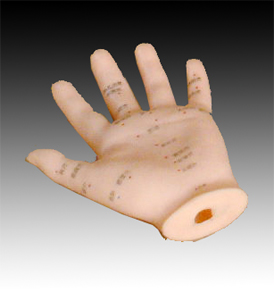 用軟而光亮的PVC制成的大規(guī)格的人手模型,顯示手背上的20個穴位和手心上13個穴位,穴位用漢字或數(shù)字標(biāo)注。附中英文使用手冊。