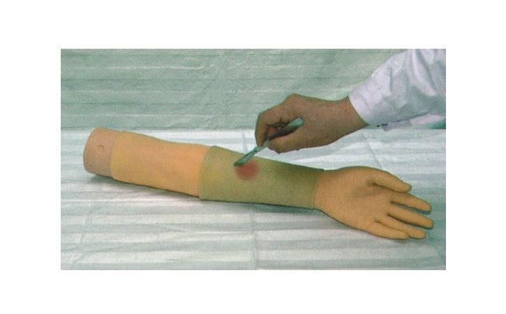 上肢膿腫切開模型采用先進(jìn)高分子材料制作,1個(gè)分膿腫,膿腫處可見(jiàn)局部皮膚隆起,其周圍有一潛行小膿腫,用于訓(xùn)練膿腫切開后的處理。