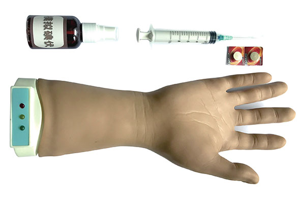 ■如果穿刺定位正確,與模型相連的控制盒上會(huì)相應(yīng)亮起綠燈, 如進(jìn)針正確會(huì)亮黃燈,如碰到神經(jīng)則亮紅燈。其皮膚為天然乳膠制成,可更換。