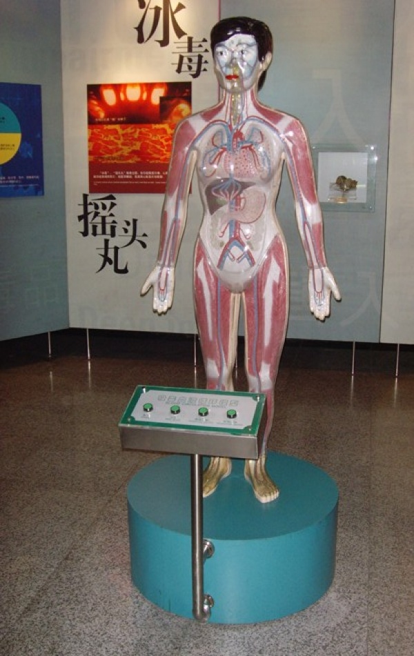 模型演示鼻吸、口服、靜脈注射、肌肉注射四種吸毒的血液循環(huán)。