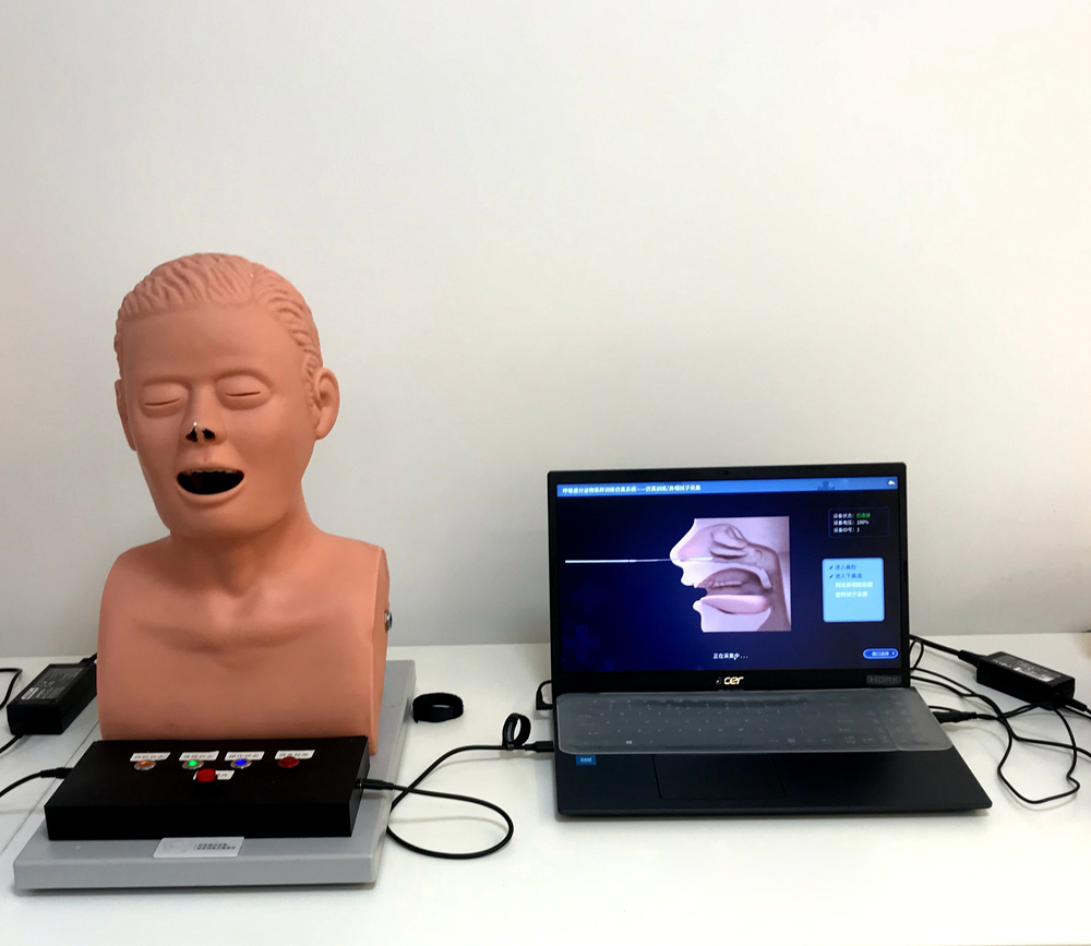 呼吸道分泌物采集訓練仿真系統(tǒng),針對鼻咽和口咽拭子分泌物的采集訓練而設計,系統(tǒng)分為硬件及軟件部分,在鼻咽及口咽相關(guān)位置設置傳感器,通過真實的鼻拭子或咽拭子在呼吸道分泌物采集模型上進行訓練,按照采集的標準流程,可以對操作過程中的路徑、位置等信息進行采集,并反應到PC端的模型上,形象化的展示拭子在采集過程中所處的解剖位置以及采集的部位是否正確,手感真實,可用于培訓及考核。