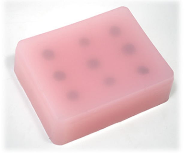 內(nèi)部含9個(gè)模擬腫塊,腫塊大小5~20mm大小不等,深度于皮膚下方15~35mm區(qū)域內(nèi),可以在超聲下顯示高回聲,邊界清。模型為肉色非透明狀態(tài)。