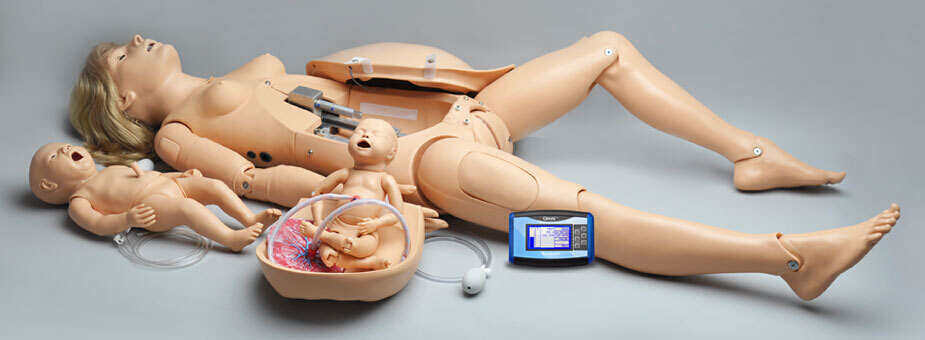 | Designed to provide a complete birthing experience before, during, and after delivery. Simulator features include full-size articulating female manikin, intubatable airway with chest rise, IV arm for meds/fluids, removable stomach cover, practice Leopold maneuvers, multiple fetal heart sounds, automatic birthing system, measure head descent and cervical dilation, multiple placenta locations, replaceable dilating cervices, one articulating birthing baby (SB32873U) with placenta, and one resuscitation baby with intubatable airway and umbilical catheter site. Comes with four umbilical cords, two dilating cervices, two umbilical clamps, talcum powder, water-soluble silicone lubricant, instruction manual, and carrying bag. |